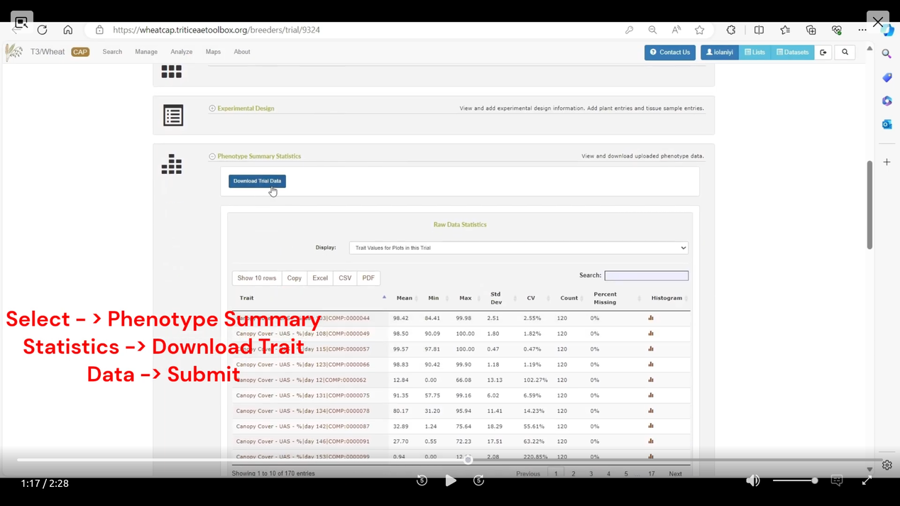 This video shows you how to find one or more trials from a particular breeding program and how to download all of the trait data for a trial from the trial detail page.